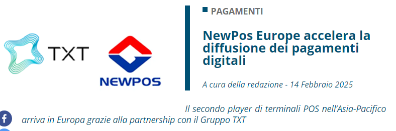 NewPos Europe, created through the partnership between NewPos Technology Limited, a leading Asian provider of POS terminals and the second-largest in the Asia-Pacific region, and TXT Group, a Milan-based Italian leader in the technology sector, offers secure, reliable, and advanced payment products and solutions to drive the European development of digital payment acceptance systems...